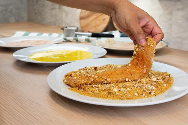 To bread the fish, coat with flour and shake off any excess. Dip into egg wash and place into seasoned almond and breadcrumb mixture. Press down gently to adhere crumb coating.