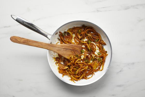 In a pan, heat oil over medium-high heat. Add sliced chili, garlic, and cumin seeds and cook for 15 to 20 seconds, then add onions and chopped kale stems. Sauté for 1 minute or until onions are soft but not browned. Add kale leaves and sauté until wilted.