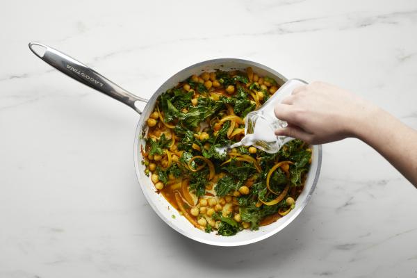 Add ground coriander, turmeric powder and cayenne powder. Stir to combine well and coat kale in the spices. Add chickpeas and 250 mL (1 cup) of water, and cook for 5 minutes.
